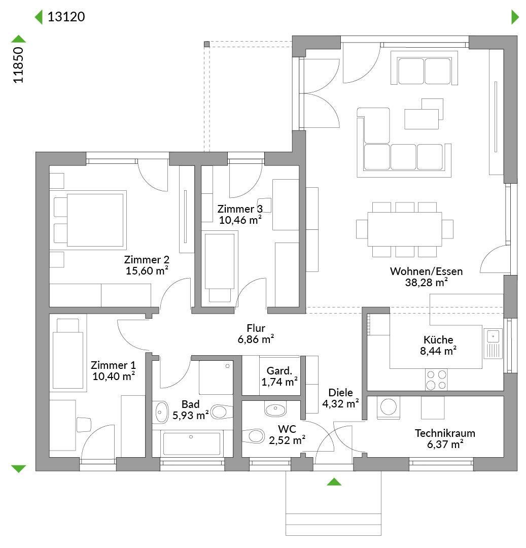 Wohnen auf einer Ebene - Wohnkomfort und Lebensqualität für Familien mit Kindern oder für Bauherren in der zweiten Lebenshälfte. Stellen Sie sich vor, Sie treten am Morgen vom Bett aus direkt auf die Terrasse und begrüßen den Tag. Sie genießen die Lichtspiele der Jahreszeiten dank großer Fensterflächen. Die geschützte teilüberdachte Terrasse hält ein gemütliches windgeschütztes Plätzchen bereit.