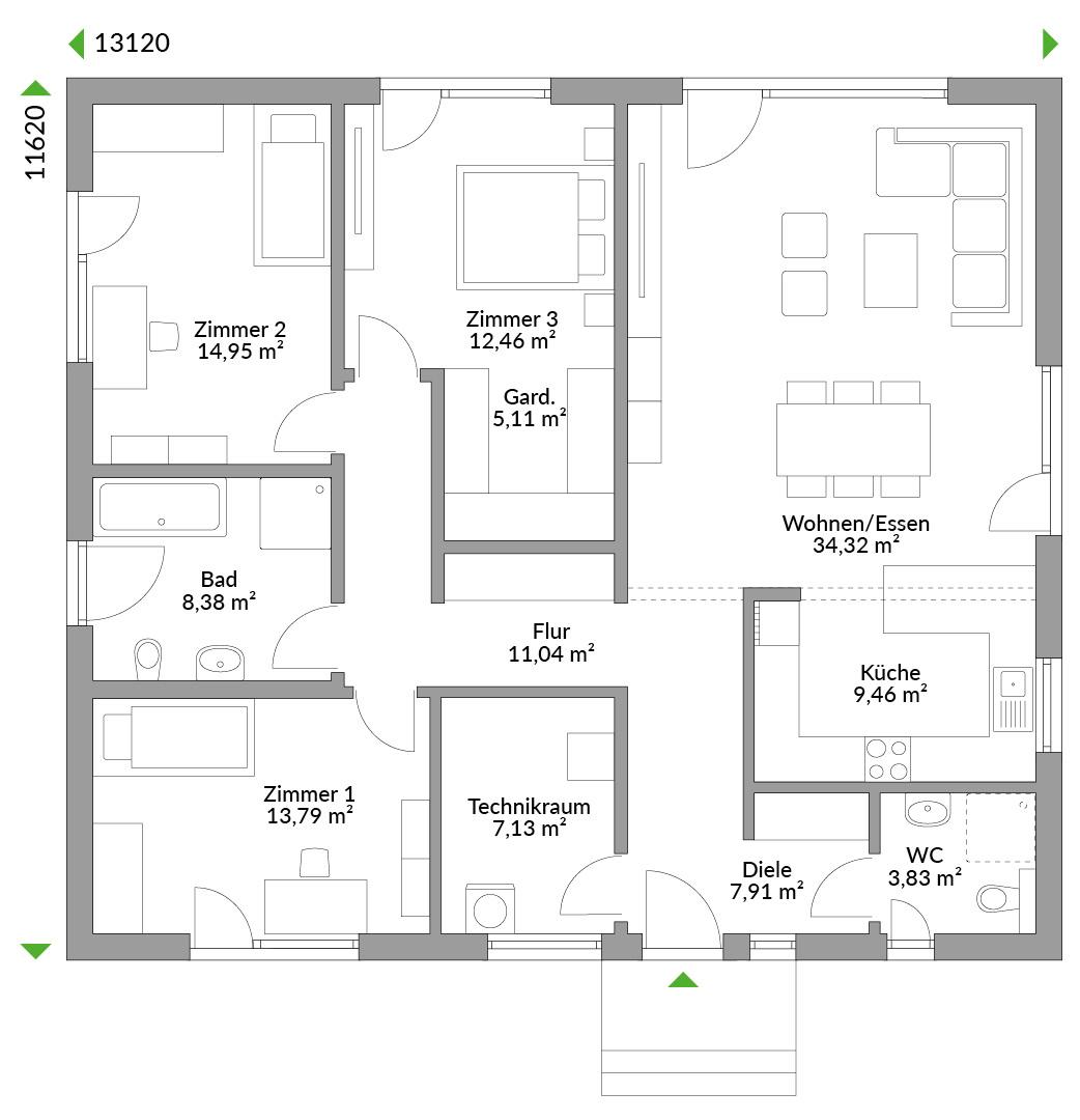 Die Nutzungsmöglichkeiten dieses Bungalows sind einfach großartig. Zwei Grundrissvarianten bieten mit vier Zimmern und zwei Bädern Platz für eine Großfamilie genauso für das entspannte Zusammenleben mit einer Pflegekraft im Alter. Hier lassen sich die Lebensentwürfe von Jung und Alt gleichermaßen verwirklichen. Kommunikatives Zentrum ist der rund 45 m² große Wohn- und Essbereich mit offener Küchenlösung. Bodentiefe Fenster lassen Innen und Außen zu einem schönen Ganzen verschwimmen.