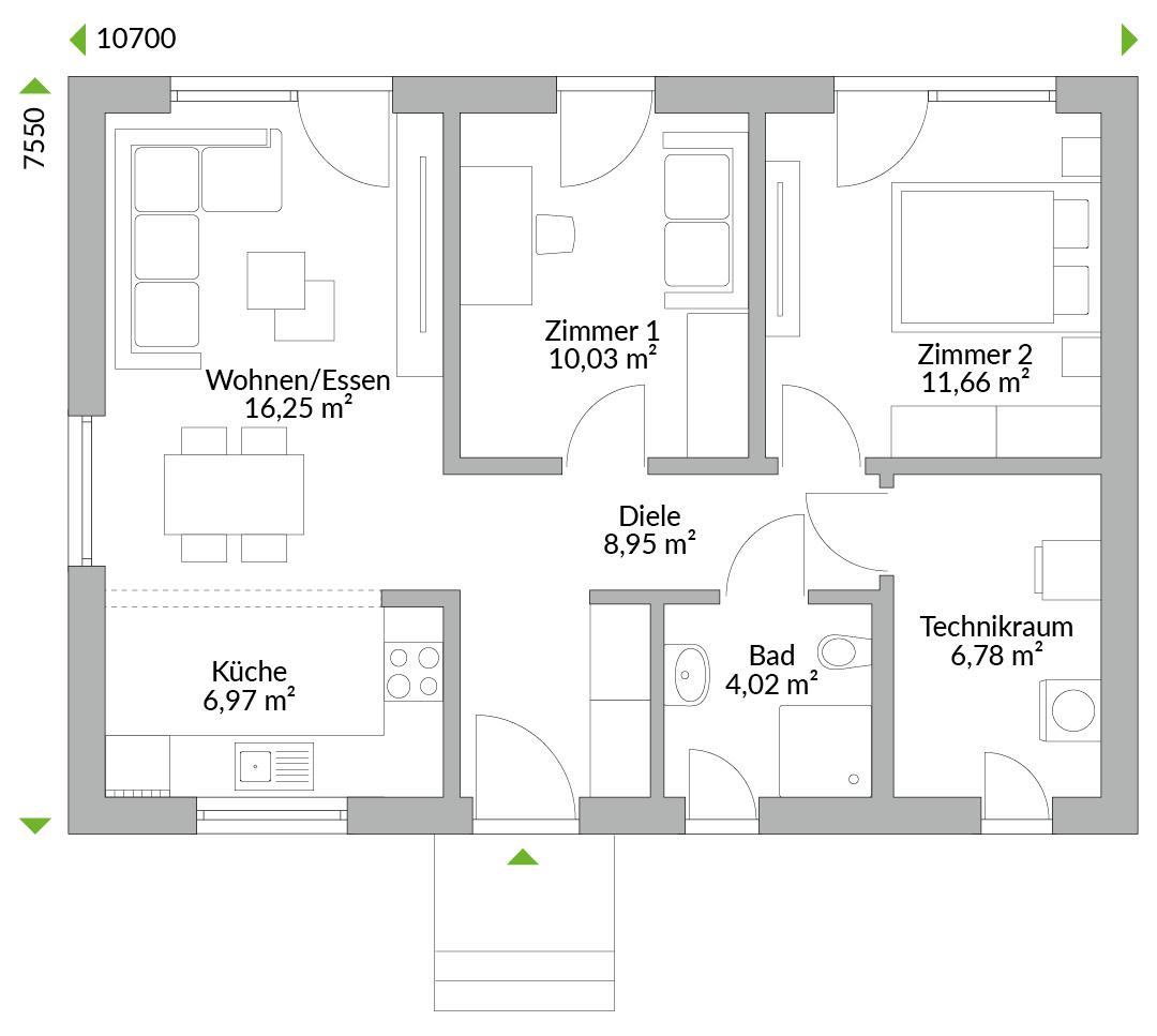 Der Bungalow Family 65 bietet mit seiner modernen, minimalistischen Gestaltung und seinen klaren Linien attraktiven Wohnraum für Singles oder Junggebliebene, die in den eigenen vier Wänden leben wollen. Aber auch als Ferienhaus ist der Minibungalow aus dem Familyprogramm bestens geeignet. Das helle Interieur mit großen Fenstern zum Garten verbindet Innen- und Außenbereiche nahtlos. Auf ca. 65 m² finden sich ein offener Wohn- und Essbereich, eine separate Küche, zwei gemütliche Schlafzimmer, ein Duschbad sowie ein Technikraum. Klein, fein, mein – so lässt sich dieses eigene Familyhaus auf den Punkt bringen.