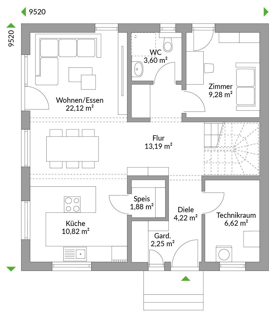 Ein zusätzliches Arbeits- oder Hobbyzimmer im Erdgeschoss bietet dank einer vorgelagerten zusätzlichen Garderobensituation absolute Ruhe zum Arbeiten oder Rückzugsmöglichkeit vom sonst trubeligen Alltag im Erdgeschoss. Auch beim Family 147 gilt. Wessen Baurecht es zulässt, kann mit einer Kniestockerhöhung mehr Wohnfläche gewinnen. Zusätzliches Licht gewinnt man optional durch ein Dachflächenfenster im Treppenhaus.